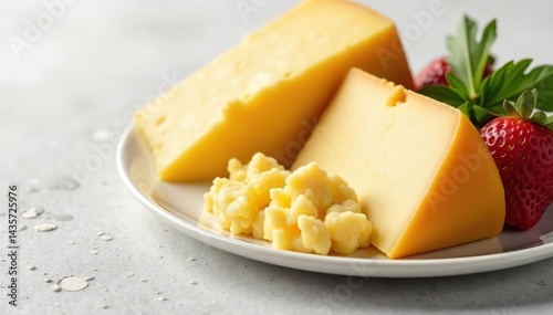 Elegant cheese selection, aged cheddar, brie, white setting, variety, background