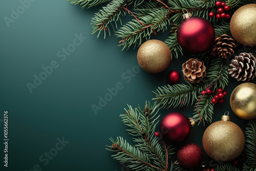 christmas, ornament, decoration, festive, red, gold, bauble, pine cone, firbranch, background, green, holiday, season, celebration, december, christmas, winter, traditional, colours, vibrant, bright, shiny, metallic, texture, nature, natural, pine, cone, tree branch, plant, arrangement, design, decorative, style, aesthetic, elegance, glossy, detail, closeup, craftsmanship, culture, generative, ai, illustration, decor, copy space