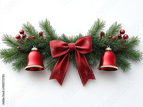 Elegant Christmas garland frame 3D Christmas bells with a red bow and pine branches on white background