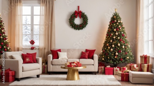 Elegant Christmas Living Room with Decorated Tree, Wreath, and Wrapped Gifts in Red and Gold Theme