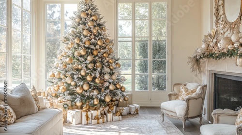 Elegant Christmas living room with flocked tree, gold ornaments, presents, and fireplace.