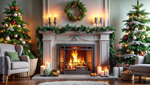 Elegant Christmas living room with warm fireplace and beautiful decorations
