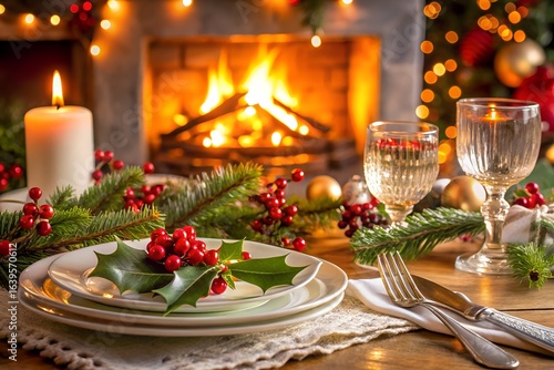 Elegant christmas table setting with a cozy fireplace backdrop, featuring candles, wine glasses, and festive decorations for a holiday dinner
