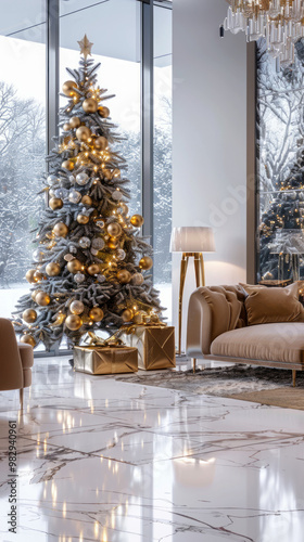 Elegant Christmas Tree in Modern Living Room with City View, Concept of Festive Home Decor, Urban Christmas Celebrations, Cozy Holiday Atmosphere. Vertical