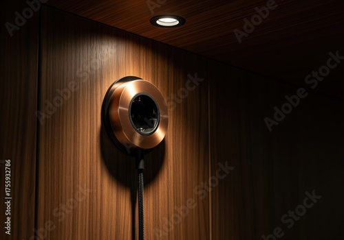 plug, mains outlet, copper, smart, wood, walnut, circular, panel, dark, elegant, brushed, power, electricity, outlet, connection, cable, modern, design, interior, technology, minimalist, sleek, stylish, luxury, architectural, spotlight, light, illumination, brown, texture, grain, detail, home, wall, furniture, shadow, glow, contemporary, innovation