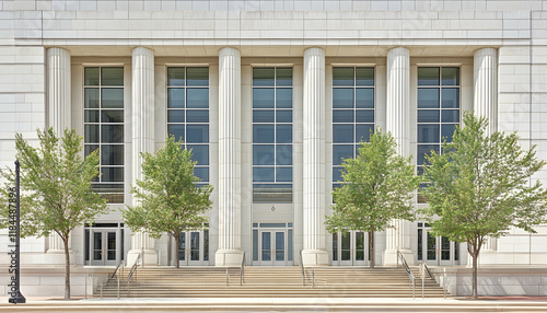 Elegant classical building facade with Ionic columns, large windows, and lush green trees. Ideal for corporate, architectural, or government themes.
