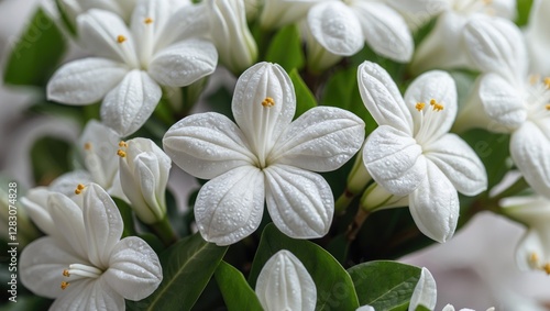 Elegant Close-Up of Fresh White Ixora Flowers with Delicate Petals and Lush Green Leaves in a Natural Setting.
