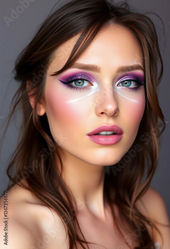 Elegant close-up portrait showcasing a youthful woman wearing dramatic purple and white eye makeup, paired with glossy pink lips and flawless glowing skin.