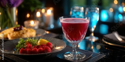 cocktail, dinner, gourmet food, raspberry, crystal glass, candlelight, eatery, luxury, evening, appetiser, drink, fine dining, celebration, social gathering, cookery, dessert, hospitality, table setting, meal, favor, sweet, tart, culinary, romantic, sophisticated, glassware, garnish, herb, fresh fruit, intimate, upscale, taste, savour, dining table, enjoyment