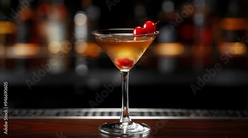 Elegant cocktail with cherries served in a martini glass on a wooden bar at a dimly lit venue in the evening