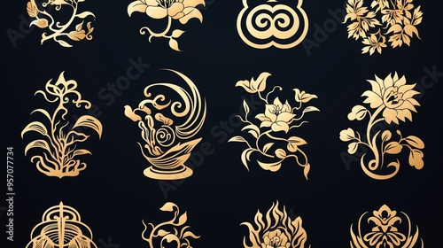 Elegant collection of golden floral designs on a dark background, perfect for artistic decoration and creative projects.