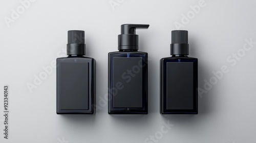 Elegant collection of sleek black cosmetic bottles arranged in a minimalist style on a clean surface, perfect for branding.