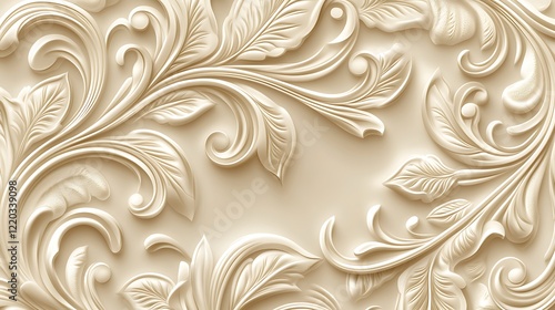 cream, floral, scrollwork, design, elegant, swirl, leaf, pattern, background, texture, ornate, relief, three-dimensional, carving, embossed, art, decorative, motif, arabesque, vintage, classic, baroque, rococo, renaissance, antique, detail, intricate, luxury, sophisticated, style, wallpaper, illustration, graphic, image, surface, aesthetic, beauty, symmetry, graceful, flowing