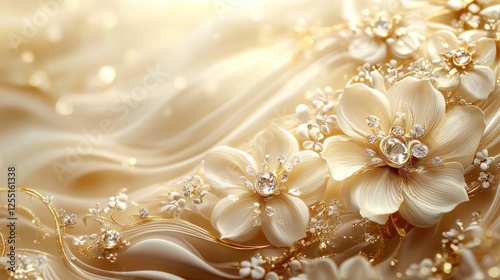 Elegant cream-colored flowers adorned with golden gems and pearls on a flowing cream fabric background.