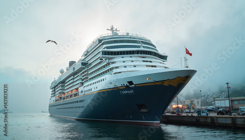 Elegant cruise liner at serene port in morning mist, tranquil journey
