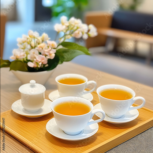 Elegant Cups of Tea on a Wooden Tray with Fresh Flowers in a Relaxing Environment
