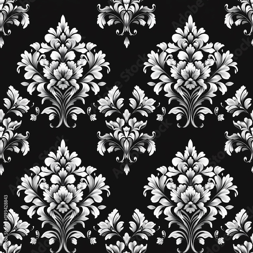Elegant damask seamless pattern fabric with intricate motifs black background textile design home decor modern aesthetic