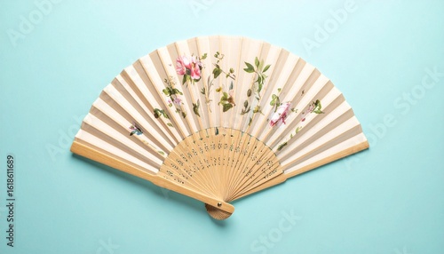 _Elegant decorative fan adorned with vibrant floral design on soft pastel background.