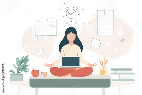 elegant design, concept of meditation during working hours, break, health benefits of the body, mind and emotions, thought process