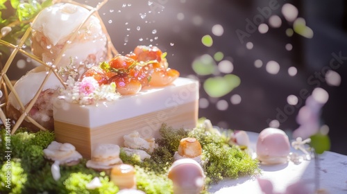 dessert, platter, caramel, fruit, moss, elegant, food, sweet, confectionery, culinary, gastronomy, pastry, treat, candy, epicure, delicacy, luxury, presentation, wooden, box, white, spring, floral, beautiful, artistic, fine dining