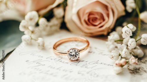 Elegant diamond engagement ring on a handwritten wedding invitation with floral accents in a bright composition