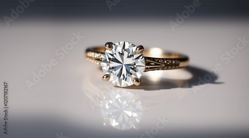 Elegant diamond ring on reflective surface. Sparkling solitaire gemstone set in a gold band.
