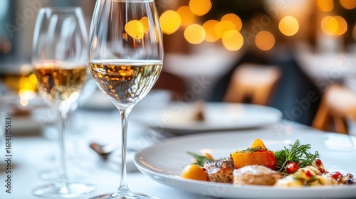 Elegant Dining Experience with White Wine and Gourmet Cuisine