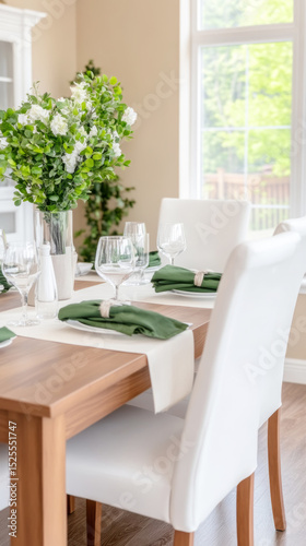 dining, elegant, room, setup, green, earth, tone, contemporary, decor, home, interior, design, style, arrangement, furniture, sophisticated, muted, wall, natural, theme, aesthetic, modern, luxurious, cosy, inviting, ambience, table, chair, napkin, centrepiece, flower, vase, window, light, bright, roomy, tranquil, harmonious, chic, tasteful, polished, refined, fresh, setting, atmosphere, serene