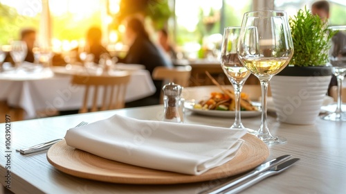 Elegant dining setup with white napkin, wine glasses, and a delicious meal in a bright restaurant atmosphere.