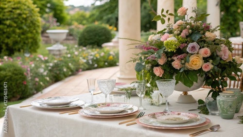 Elegant dining table surrounded by lush greenery and vibrant floral arrangement in soft pastel hues, botanical, flowers