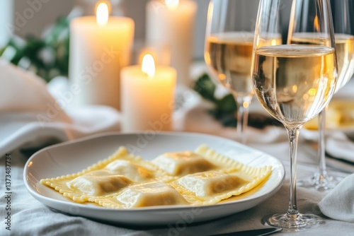 Elegant Dinner Setting with Ravioli and Wine Glasses on Table
