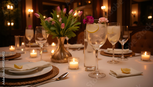 Elegant dinner table setting with cocktails, flowers, and candles creating a romantic atmosphere