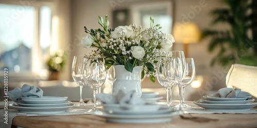 Elegant dinner table setting with floral centerpiece cozy home warm atmosphere close-up