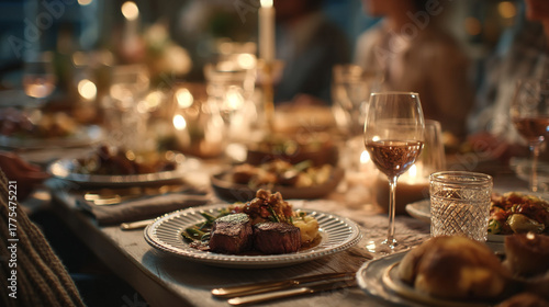 Elegant dinner table setting with steak wine and candlelight ambiance