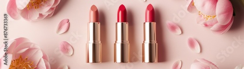 Elegant display of three lipsticks with a floral background, perfect for beauty and makeup themes. Ideal for cosmetic imagery.