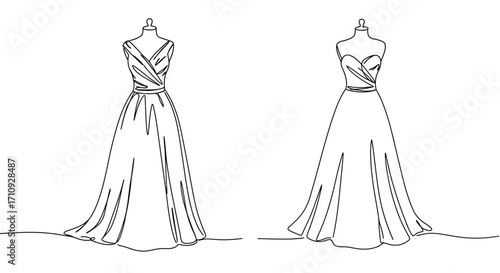 fashion, dress, design, vignetting, illustration, garment, clothing, style, sewing, evening dress, formal dress, gown, line art, black-and-white, monochrome, drawing, mannequin, drape, fabric, silhouette, minimalist, elegant, sophisticated, chic, fashionable, creative, artwork, fashion design, outfit, apparel, front view, half face