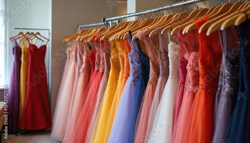 Elegant dresses hang on wooden hangers. Rental boutique offers curated selection formal attire, colorful wedding dresses, evening gowns, prom dresses, party wear. Sophisticated fashion for special
