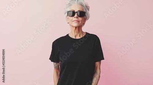 t-shirt, black, fashion, clothing, elderly, woman, stylish, minimalist, modern, confident, blank, design, apparel, template, chic, unisex, photoshoot, casual attire, brand, product, trendy, presentation, lifestyle, elegance, sophistication, urban, statement, timeless, promotional, contemporary, classic, bold, branding, wearable, neutral