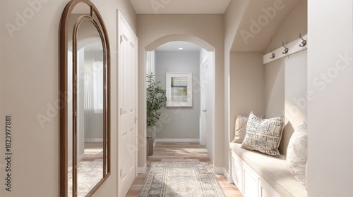 entranceway, hallway, interior, home, modern, mirror, bench, arch, doorway, decor, architecture, furniture, rug, plant, wall, light, bright, neutral, beige, wood, floor, cushion, pillow, hook, storage, cabinet, residential, indoor, house, apartment, contemporary, clean, simple, minimalist, decoration, furnishing, comfortable, inviting, serene, peaceful, roomy, open, airy, fresh, elegant, sophisticated