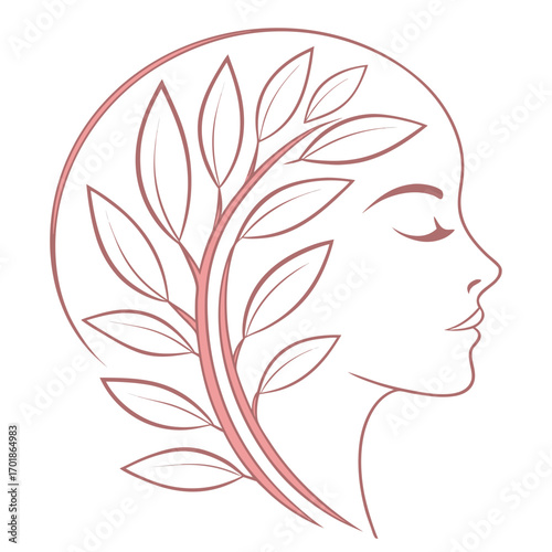 "Elegant feminine profile intertwined with delicate leaves, symbolizing natural beauty and growth."