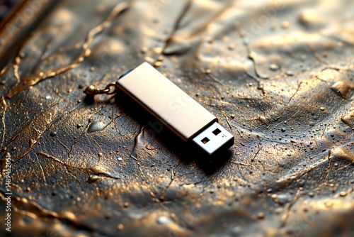 elegant flat lay of usb flash drive on a metallic surface texture, with antique gold shades, soft window glow, minimal accents, high resolution