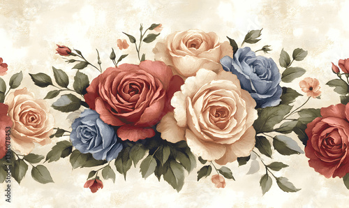 Elegant floral arrangement featuring blush, red, and blue roses, painted in a vintage style against a textured beige background; perfect for home decor or textile design.
