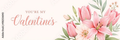 Elegant floral bouquet with pink tulips and lilies, Valentine's Day sentiment