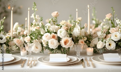 table, setting, floral, centrepiece, white, candle, plate, silverware, goggles, flower, rose, ranunculus, greenery, formal, event, dining, arrangement, decoration, elegant, wedding, celebration, occasion, party, gathering, special, design, decor, delicate, soft, light, neutral, pastel, romantic, luxury, chic, style, refined, beautiful, sophisticated, exquisite