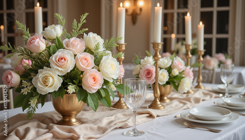floral, centrepiece, wedding, rose, peony, celebration, decoration, elegant, indoor, event, table, soft light, romantic, flower, candle, banquet, closeup, arrangement, beauty, luxury, design, festive, atmosphere, detail, dining, decor, party, joyful, inviting, pastel, harmonious, colours, floral pattern, reception, setting, joy, blurred background, tableware, goblet, porcelain, gathering, sophistication, no people, 1, harmony, dinner