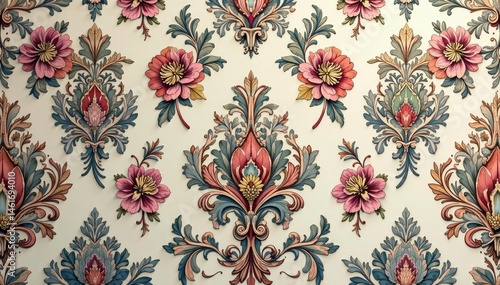 Elegant floral damask pattern, intricate design in muted tones, print, floral