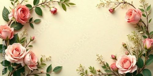 Elegant Floral Frame with Delicate Pink Roses and Greenery, Ideal for Wedding Invitations or Romantic Announcements