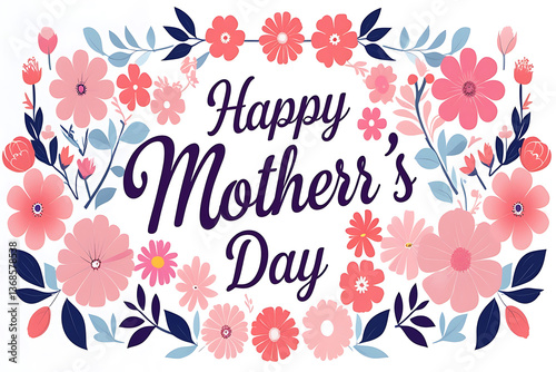 Elegant Floral Mother's Day Digital Illustration with Cursive Happy Mother's Day Text and Vibrant Pink, Coral, and Blue Flowers