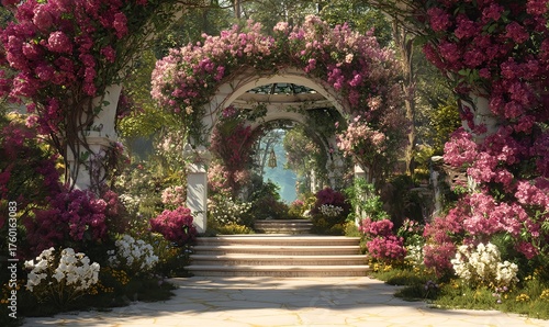 Elegant floral passageway filled with blooming pink petals and dappled sunlight in a tranquil courtyard