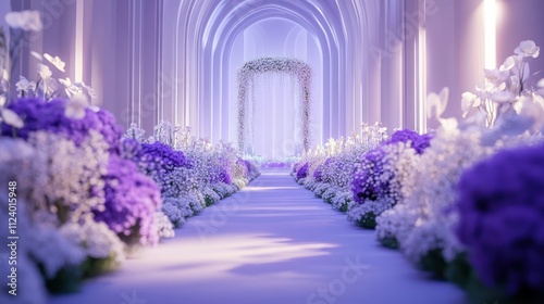 flower, archway, pathway, purple, white, decoration, ceremony, venue, event, design, elegance, beauty, nature, arrangement, aisle, celebration, light, ambience, romantic, setting, wedding, indoor, architecture, floral, harmony, colours, calmness, space, symmetry, style, luxury, soft, atmosphere, modern, artistic, visual, decor, planning, season, bloom, aesthetic, charme, joy, gathering, festivity, serenity, church, building